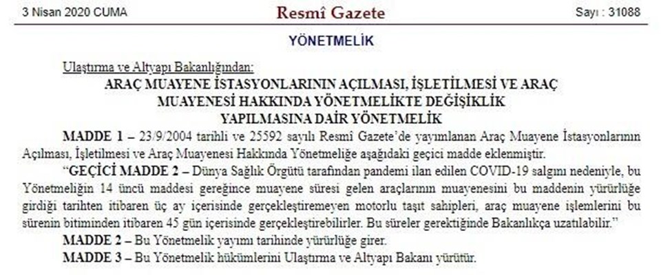 Koronavirüs pandemisi nedeniyle muayene süresi gelen ve yaptıramayanlar için üç aylık süre tanındı. Üç aylık sürenin sonunda 45 gün içinde araç muayenesinin yaptırılması şartı getirildi. Bu süre gerektiği takdirde Bakanlıkça uzatılabilecek.