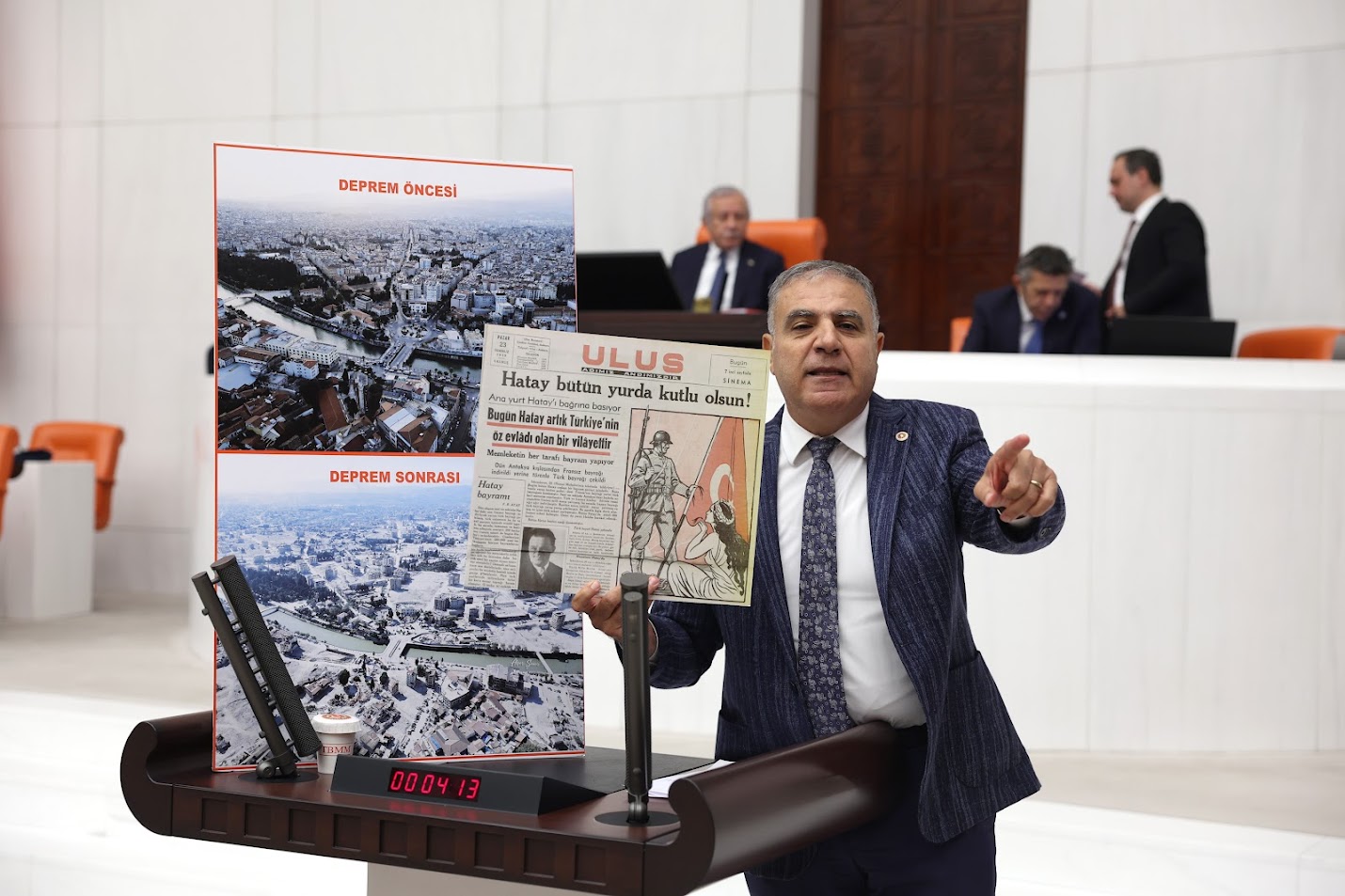 “Şu an elimdeki bir gazete küpürü, 23 Temmuz 1939 tarihli Ulus gazetesi. Ne diyor burada: ‘Bugün Hatay artık Türkiye'nin öz evladı bir vilayettir.’ Ama AKP iktidarı bu öz evlat olan vilayeti üvey evlat hâline getirdi. Burada AKP milletvekillerinin ellerini vicdanlarına koyarak beni dinlemelerini istiyorum. Hatay'da toplam teslim edilmesi gereken konut sayısı 158 bin 200, anahtar teslimi yaptığınız konut sayısı ne kadar biliyor musunuz? 6.868 yani yapacağınız konutun sadece yüzde 4,3'ü... Yerleşen hane sayısı ne kadar? 3.320. Defne'nin yüzde 90'ı yıkılmış. 21.655 konut yapma sözü verdiniz. 20 ayda kaç konut teslim ettiniz? 130 yani binde 6. Sayın AKP milletvekilleri, bu vicdana sığıyor mu? İçişleri Bakanı açıklama yaptı, dedi ki: ‘11 ilde 101 bin konutu biz bitirdik.’ Hatay'da yüzde 50 yıkım olduğuna göre demek ki siz şu ana kadar 50 bin konut teslim etmeniz gerekirken teslim ettiğiniz 6.868 yani yüzde 6,8. Böylece Hatay'ı hep üvey evlat olarak görüyorsunuz.”