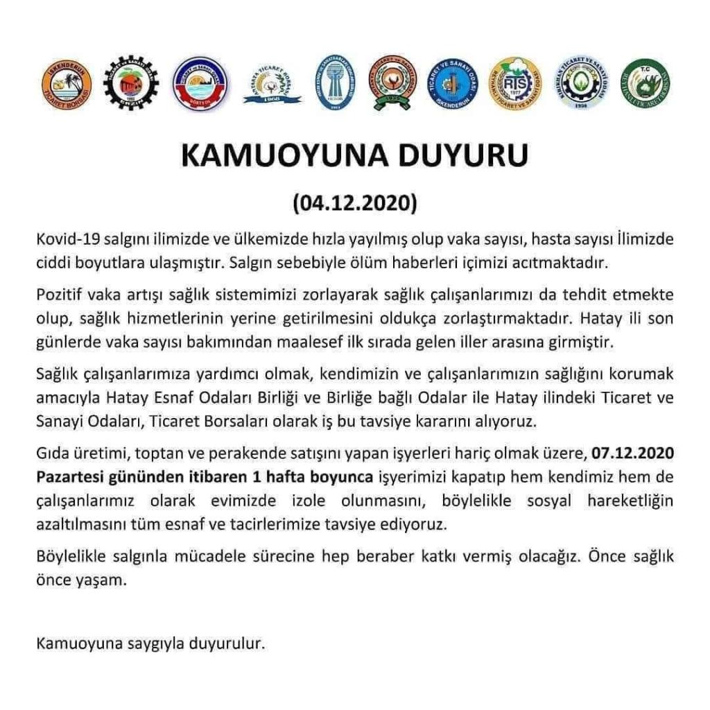 Gıda üretemi,toptan ve perakende satışı yapan işyerleri hariç olmak üzere 07.12.2020 Pazartesi gününden itibaren 1 hafta boyunca işyerlerimizi kapatıp hem kendimiz hem de çalışanlarımı olarak evimizde izole olunmasını, böylelikle sosyal hareketliğin azaltılması tüm esnaf ve tacirlerimize tavsiye ediyoruz.