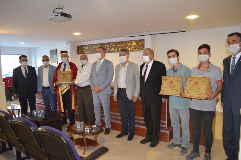 Hatay’da Yılın kalfası seçilen Yavuz Selim Kara ile yılın çırağı seçilen Basri Alkan Benden’e plaketleri Belediye Başkanı Ayhan Yavuz tarafından verildi.