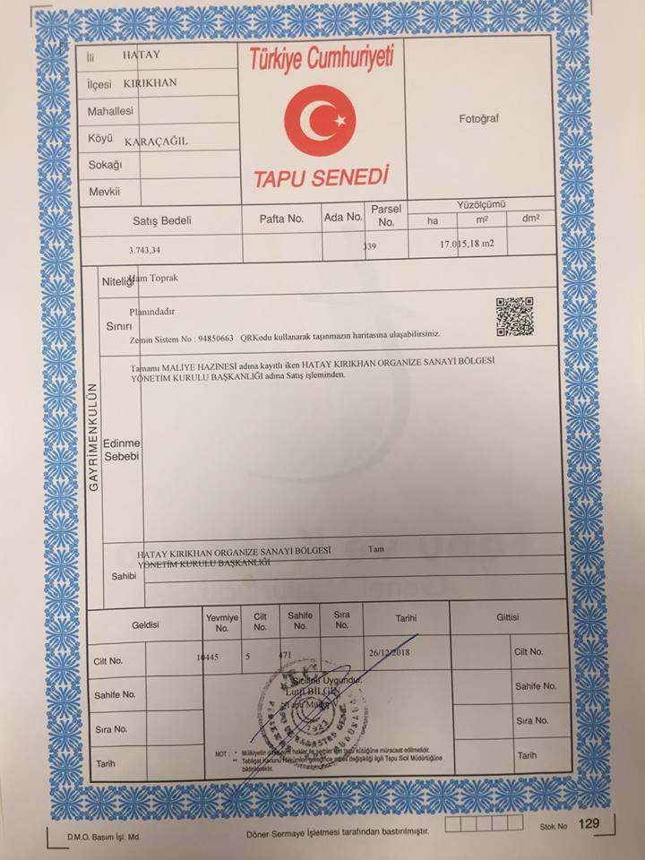Kırıkhan Organize Sanayi Bölgesi çalışmaları sonucunda Organize Sanayi Bölgesi Tapusu alındı.