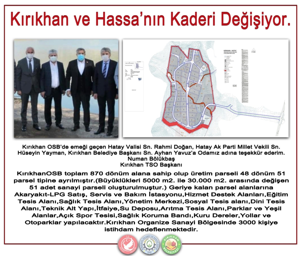 Konu ile açıklamada bulunan Kırıkhan Ticaret ve Sanayi Odası Başkanı Numan Bölükbaş ; Kırıkhan ve Hassa’nın kaderini değiştirecek olan Kırıkhan Organize Sanayi Bölgesinde son aşamalara gelindi. Kırıkhan’a kurulacak olan Organize Sanayi Bölgesi bölgedeki işsizlik sorununa da çözüm olacaktır. OSB’de 3000 kişiye istihdam hedeflenmektedir. “dedi.