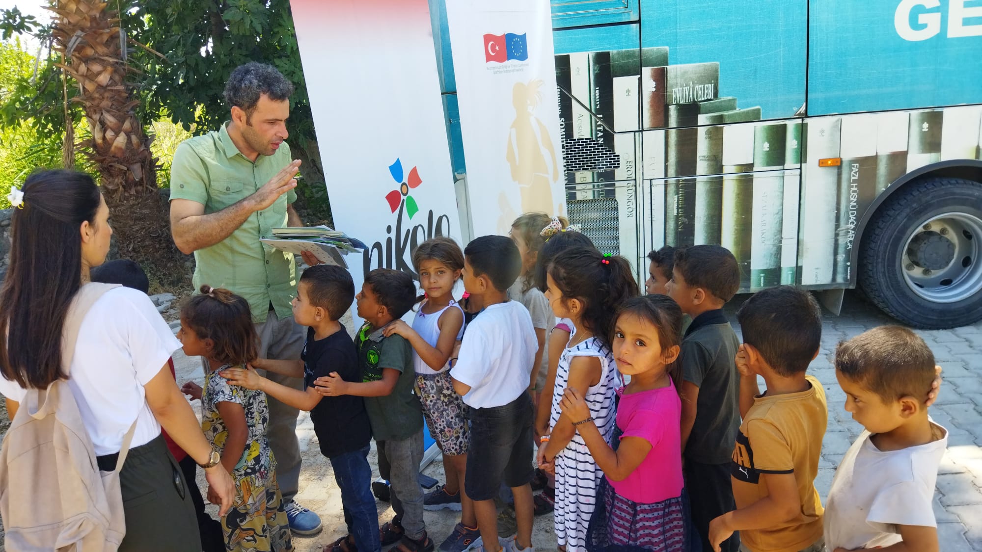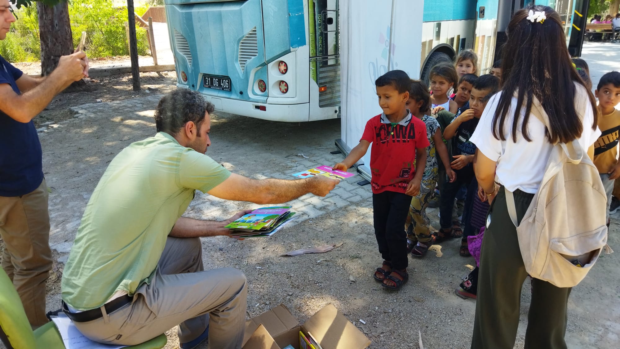Kırıkhan Halk kütüphanesi Müdürlüğünce yapılan çalışmada Kırıkhan Çamsarı Mahallesi'nde yaşayan mevsimlik, göçer, yarı göçer tarım işçilerinin çocukları gezici kütüphaneyle buluşturuldu.