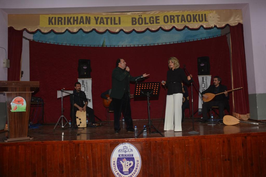 Kırıkhan Yatılı Bölge Okulu Spor salonunda gerçekleşen Müzik dinleti programına Kırıkhan Kaymakamı Zafer Karamehmetoğlu, Belediye Başkanı Ayhan Yavuz, İlçe Milli Eğitim müdürü İ. Cahit Ayazhan, Kaymakamlık Yazı İşleri Müdürü Gülfinaz Gövler, idari amirler ve kalabalık bir öğrenci velisi katıldı.