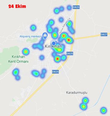 "Hayat Eve Sığar" uygulamasına göre Kırıkhan’ın vaka yoğunluk haritası. 24 Ekim 2020 tarihi ile 28 Ekim 2020 tarihi arasında haritada gözle görülür bir değişim gerçekleşti.