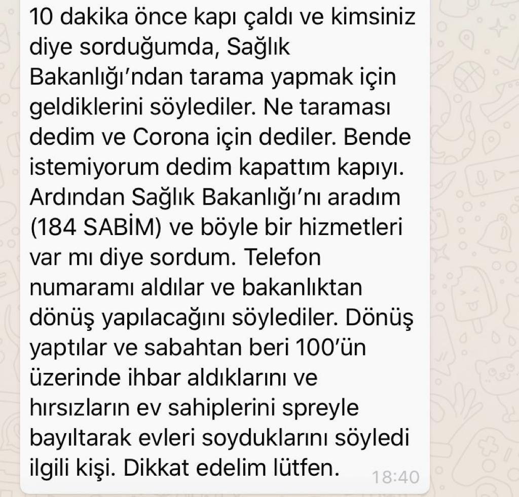 Emniyet Genel Müdürlüğü sosyal medya hesabından yapılan açıklamada, “Korona virüs risk taraması Alo 184'ün sizi araması sonrası gerçekleşmektedir. Vatandaşlarımızın iyi niyetinden faydalanıp hırsızlık, dolandırıcılık ve diğer suçlara meyilli kişilere karşı vatandaşlarımızın duyarlı olmasını, bu gibi konularla karşılaşan vatandaşlarımızın ivedi olarak kolluk birimlerine 112-155-155 haber vermesini bekliyoruz” denildi.