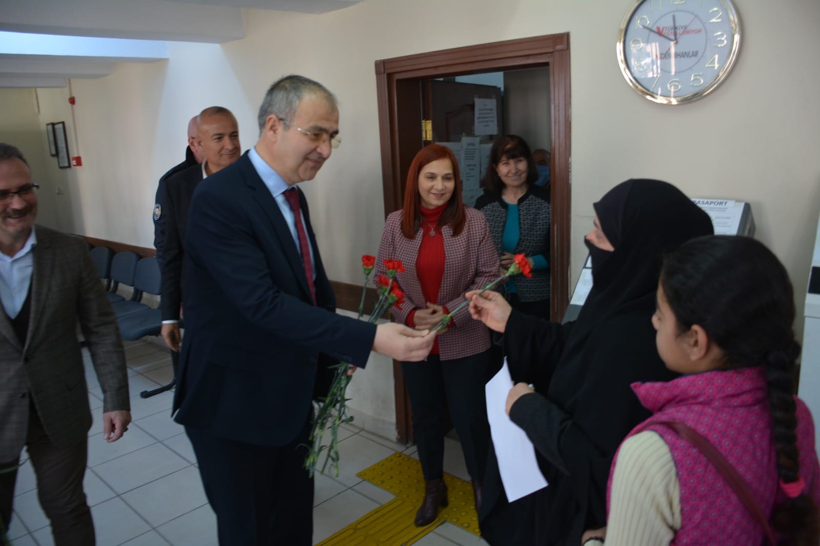 Kırıkhan Belediye Başkanı Ayhan Yavuz, Kırıkhan Kaymakamı Mahmuthan Arslan 8 Mart Dünya Kadınlar Günü dolayısıyla Kaymakamlık binasında kadın çalışanlara karanfil takdim ettiler.